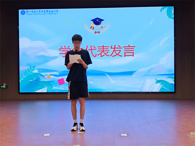 课程发展处恽彩琴主任手中的证书,是沉甸甸的青春印章。各班代表依次登台,郑重地从恽主任手中接过那本沉甸甸的毕业证书。鲜红的封面,烫金的校徽,不仅是对三年学业的肯定,更是驶向未来的通行证。随后,优秀毕业生的表彰环节,丁玉龙副校长为优秀毕业生颁发证书,将典礼推向高潮。当优秀学生代表赵胤铭站上发言席,他的话语真挚而有力,感恩母校培养,铭记师长教诲,更抒发了同窗携手、共赴星辰大海的壮志豪情,赢得了全场热烈的掌声。