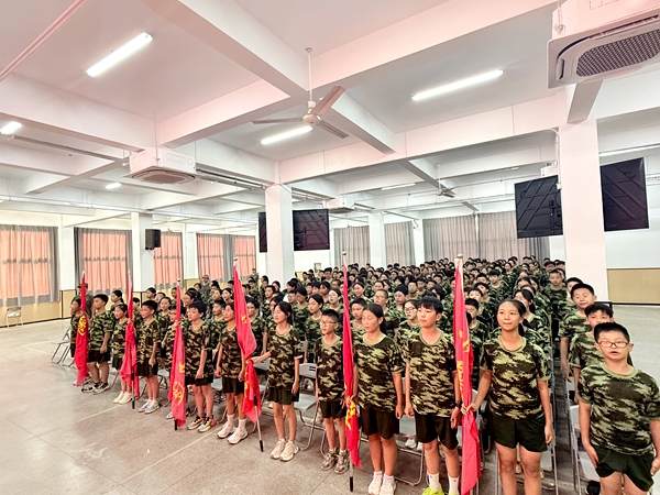 上午8:00,成长营开营仪式在庄严而热烈的氛围中正式启动。新生们身穿迷彩服,怀揣着新的期待和愿景踏入会场,他们即将以昂扬的姿态开启初中生涯的第一课。