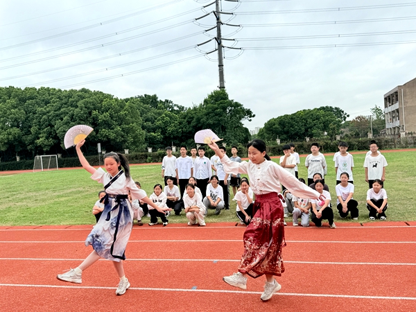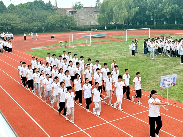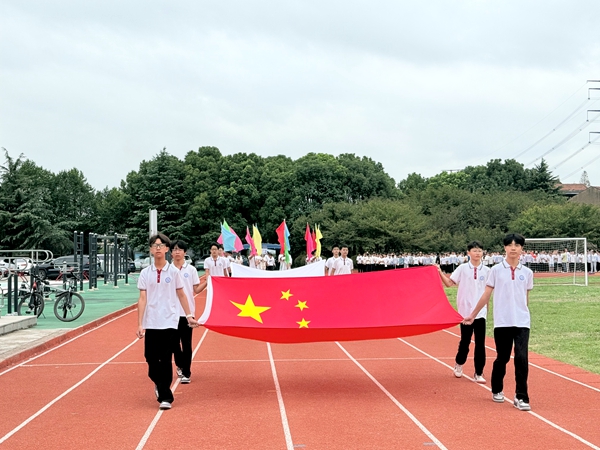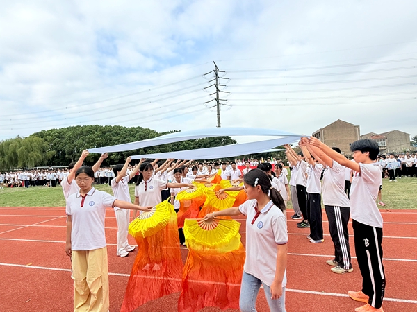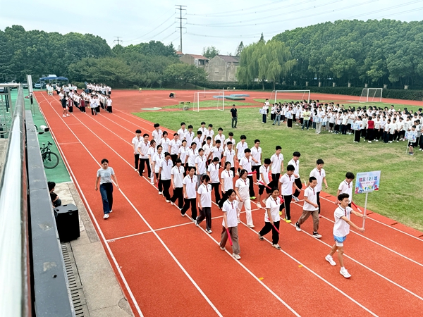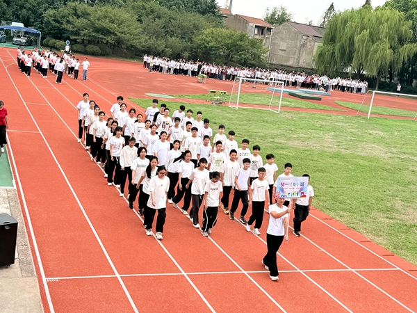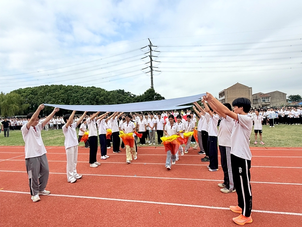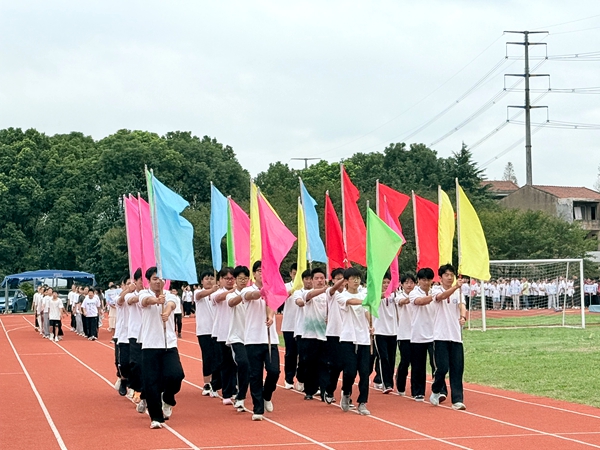 激昂的《运动员进行曲》响彻操场,国旗、校旗队以及彩旗方阵随着音乐依次入场。他们昂首阔步,斗志昂扬;他们身姿挺拔,精神饱满;他们脚步铿锵,威风凛凛;他们步伐整齐,气势恢宏。展现了新时代青少年的朝气蓬勃。紧随其后的是各班级方阵。以各具创意的艺体展示,既彰显体育与健康理念,又突出学校水文化特色。他们有的舞步优美展示青春活力,有的旌旗猎猎展现爱国情怀,有的身着汉服厚植文化自信,有的创意运动承载少年梦想。