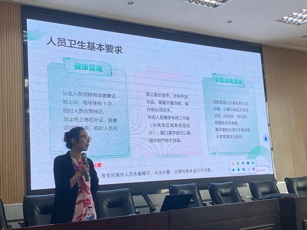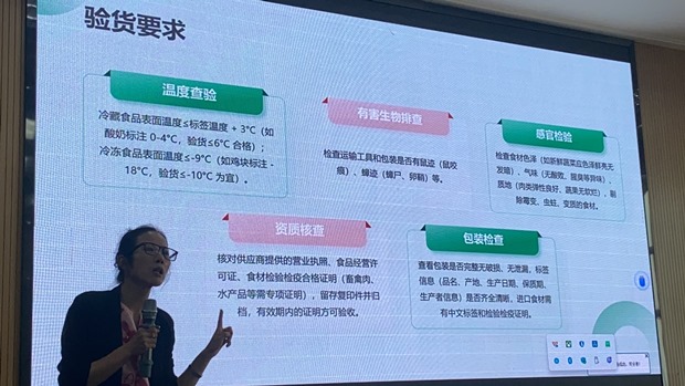 从《中华人民共和国食品安全法》的核心条款,到食材验收的温度标准;从生熟食材分开存放、烹饪中心温度≥70℃的操作细节,到餐用具清洗消毒、食品留样的具体要求……常检一诺负责人结合典型案例与现场常见问题,将复杂的规范转化为易懂的实操指南,让每一位参会人员明确“该做什么、该怎么做、为什么这么做”。