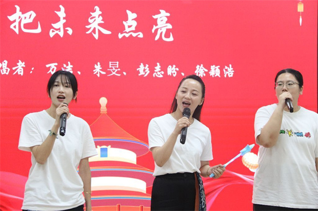 中场时分,舞台化作情感交汇的海洋。《我爱你中国》的激昂旋律如惊涛拍岸,五位老师用赤子之心编织对祖国的深情告白。另一曲《如愿》则以多层声部构建时空对话,诠释“山河无恙,烟火寻常”的愿景。三人唱《我和我的祖国》用悠扬歌声绘制血脉相连的画卷。青春活力的《我的未来式》展现幼教人奔涌向前的姿态。