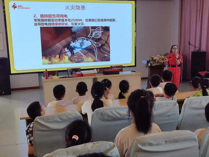 活动特邀“恐龙人防灾避险体验馆”专业讲师团队进校开展系列讲座。讲座内容涵盖消防安全、交通规则、应急逃生等多个领域。在消防安全专场中,讲师通过大屏幕动态展示疏散标志、防烟面罩使用步骤(如“开、拔、套、拉”四步法)、火源发现历史等知识,并结合实物道具(如红色应急盒、面罩模型)进行实操演示。现场学生积极参与“消防标志大PK”“定制徽章”等互动环节,在竞答与游戏中深化对安全符号的理解。