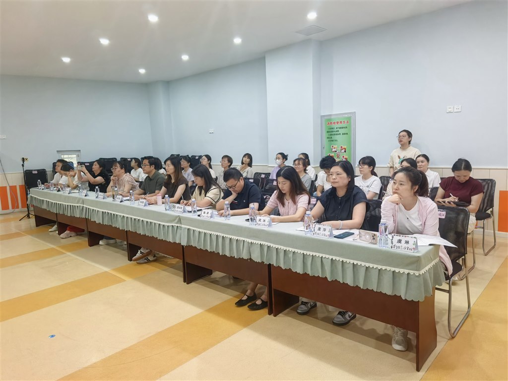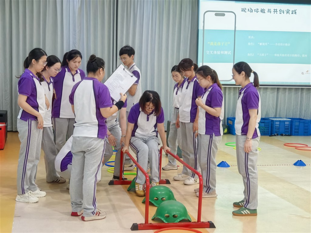 教务主任管亚静主持主题教研《情景化运动中开放性材料的运用与调整》。破冰游戏“身体总动员”点燃热情后,教师们以“双杠”为切口,现场体验、共创玩法,梳理“一物多玩、多物组合”的策略,实现材料价值最大化。生动的案例、深度的对话,赢得专家组一致好评。