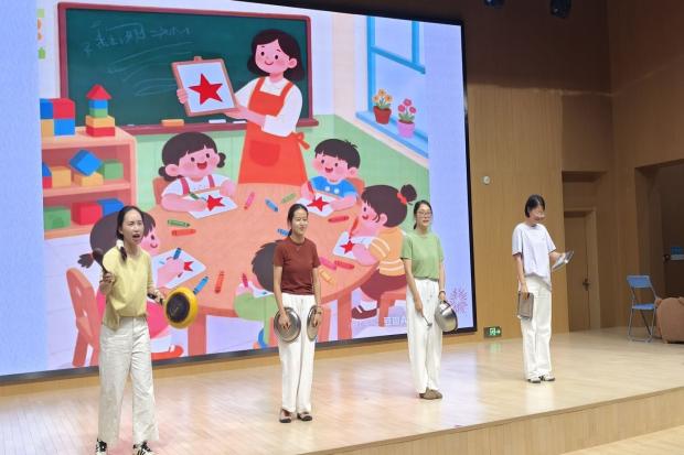 本次活动采用语言类节目表演形式,以脱口秀、相声、小品等丰富的载体,将红色历史记忆与学前教育实践深度融合,生动展现新时代幼儿教师的责任担当与教育热忱。舞台上,老师们以鲜活演绎还原经典抗战人物事迹与历史片段,让泛黄的红色故事“活”了起来;同时紧扣幼教工作实际,将宏大的抗战历史叙事,转化为贴近幼儿生活的通俗表达——或是用童趣语言讲述英雄故事,或是以课堂场景展现红色品格启蒙,既传递出对历史的深刻感悟,更流露出对幼教事业的赤诚热爱。其中《以幼教之灯,照亮抗战精神的传承之路》,凭借细腻情感与扎实表演打动全场;原创脱口秀《来宝贝,扣好人生的第一粒扣子》、《把“星星”讲给孩子听》更将抗战精神中的“爱国初心”与幼教“育人使命”紧密相连,用真实教学场景传递教育温度,凭借深刻的主题、新颖的创意获得一致好评,现场掌声此起彼伏,成为活动中的亮眼之笔。活动尾声,赵晓丽园长肯定了老师的辛苦付出,她强调:“作为我们老师要用最简单、贴近孩子的方式,播撒爱国种子。”同时要求我们要以此活动为契机,融合抗战精神与师德建设,热忱投身学前教育。