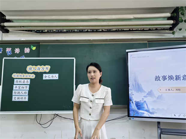 课后,刘皎老师结合五年级“民间故事”单元教学,聚焦创造性复述能力培养,分享《故事焕新意,复述辟创途》系列实践。刘老师围绕“语言表达与思维创新双提升”提出了丰富多样的教学策略。