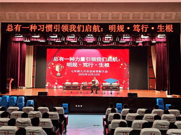 10月10日下午,常州市中天实验学校七年级召开了以“明规·笃行·生根”为主题的学生大会,会议由七年级管理小组贾静老师主持。本次大会旨在以“明规”为成长筑基,以“笃行”为成长引路,以“生根”为成长追求,引领全体七年级学子端正态度、明确方向、掌握方法,为初中三年的健康成长和卓越发展奠定坚实基础。