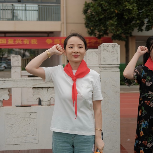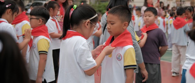 在热烈的掌声中,大队辅导员周洁宣读了新队员名单。三年级的老队员郑重地为新队员佩戴上鲜艳的红领巾。那一刻,孩子们的脸上洋溢着自豪与激动。随后,新队员在队旗下庄严宣誓:“我是中国少年先锋队队员,我在队旗下宣誓……”坚定的誓言在校园上空回荡。