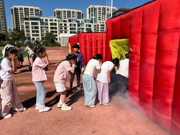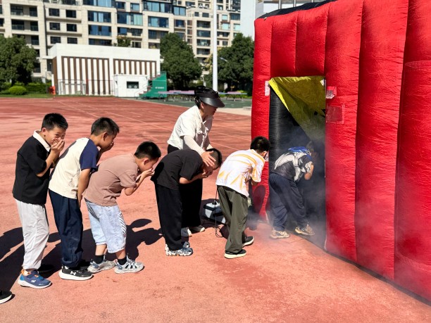 在消防逃生演练环节,通过搭建的逃生帐篷内模拟了真实火灾场景 —— 假火、烟雾弥漫,安全出口标志清晰可见。工作人员提前向学生讲解逃生要点:“火灾中有毒气体多在上层扩散,大家一定要压低重心、弯腰行走”“用湿毛巾或干衣物捂住口鼻,能有效防止浓烟呛入”。演练开始后,学生们严格遵守秩序,排成两排依次进入帐篷,在烟雾环境中冷静判断安全出口方向,避开 “火源”,有序撤离至操场安全区域,整个过程紧张有序,无拥挤、慌乱现象,充分展现了良好的安全素养。