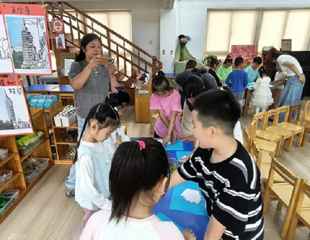 随后,观摩班级区域游戏活动。来访老师们被孩子们在游戏中所展现出的想象力、协作能力和解决问题的能力所吸引,纷纷驻足,用相机记录下一个个精彩的瞬间,并与班级教师就区域材料的投放、游戏主题的生成等细节进行了现场交流。