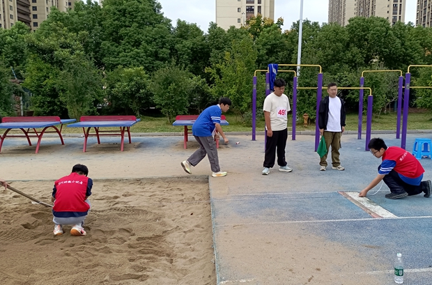 操场上,跳高选手离开垫子,就有“红马甲”们将晃动的杆子放回原位或扶稳当;跳远选手走出沙坑,就有“红马甲”测量距离,平整地面;实心球选手完成比赛,就有“红马甲”将实心球送回原地……