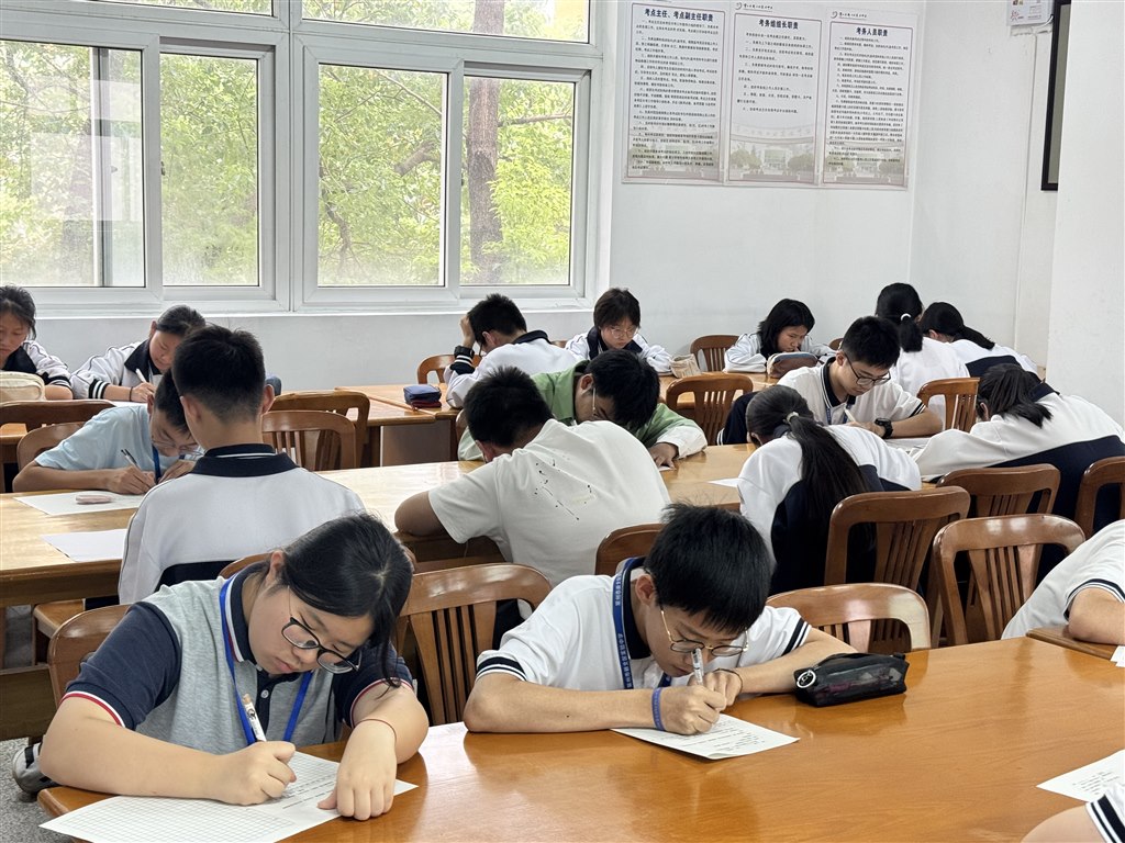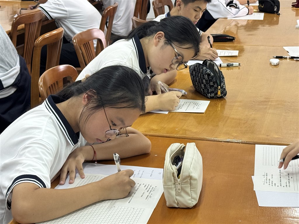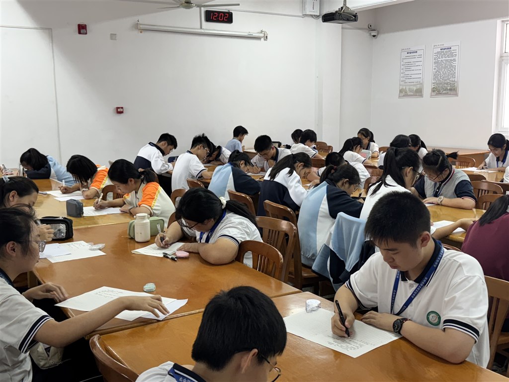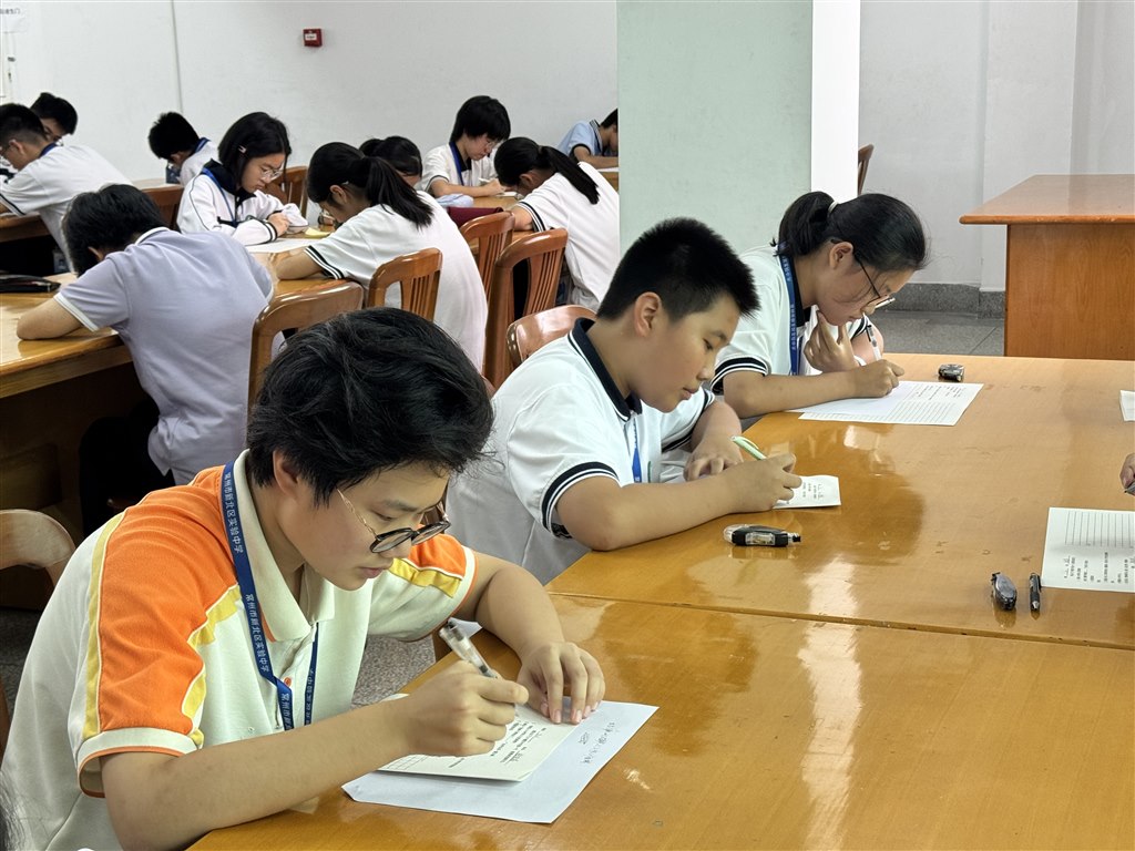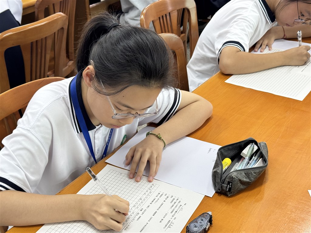 比赛现场,同学们专注的神情成为最动人的风景。有的低头沉思,在脑海中梳理写作脉络;有的提笔疾书,让灵感随着笔尖流淌;有的偶尔停顿,字句斟酌打磨表达。笔尖与纸张摩擦的“沙沙”声,交织成一首充满朝气的乐章,每一个字符都承载着同学们的思考与创造。