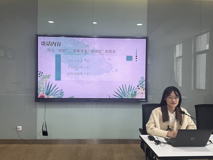 七年级张文慧老师以“用心沟通,做学生成长的同行者”为主题,从三个方面娓娓道来:在谈话内容上,她强调日常关怀要暖、学业指导要实、目标规划要细;在谈话方式上,她倡导让沟通“接地气”,善用碎片时间,告别严肃刻板;在谈话注意点上,她提出要守住边界、赋予温度,让学生真切感受到老师的关怀。张老师的细腻与共情,让在场教师深受触动。