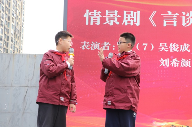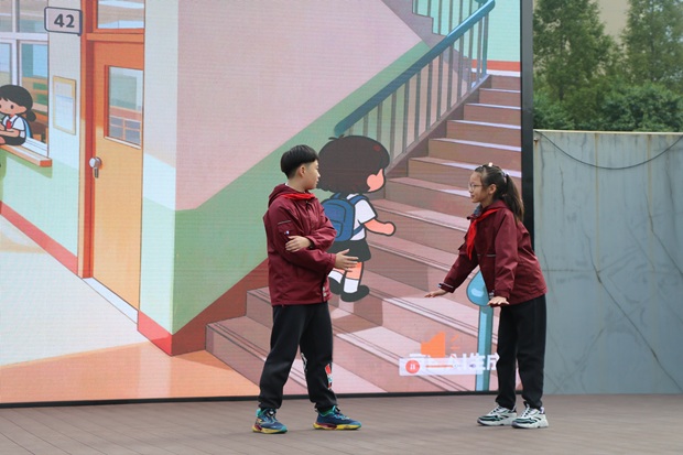 仪式之礼塑造举止风范,言谈之礼温暖校园时光。六(7)班吴俊成、任绍宁、黄钰涵等七位同学带来校园情景剧《言谈之礼,温暖你我》,生动的情节、鲜活的表演搭配幽默的语言,让师生们在欢笑声中直观感受文明用语的力量,领悟友善交谈的美好。