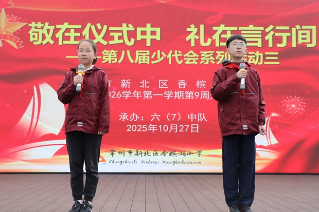 10月27日上午,常州市新北区香槟湖小学以“敬在仪式中,礼在言行间”为主题,举行2025~2026学年第一学期第九周升旗仪式。本次仪式由六7班承办,全体师生齐聚国旗下,在肃穆氛围中重温少先队仪式之礼,感受文明言谈传递的温暖力量。
