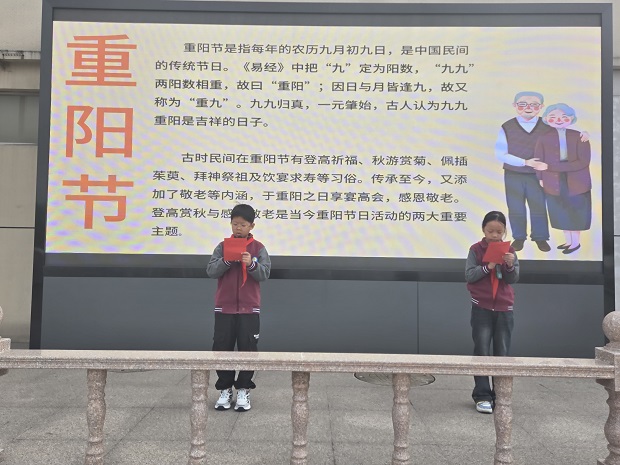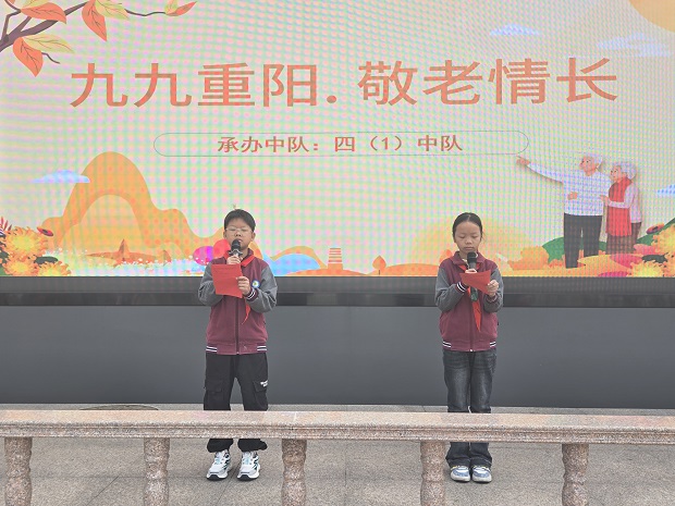 升国旗、奏国歌环节,五星红旗冉冉升起,师生们或行注目礼、或敬队礼,爱国心与敬老情在校园中交织涌动。国旗下讲话中,四(1)中队成员娓娓道来重阳节 “双九为阳” 的历史渊源,细数登高、赏菊的传统习俗,更以 “帮长辈捶背、听老人讲往事” 等暖心倡议,号召大家将敬老融入点滴生活。随后,中队成员带来的《中华孝道》表演,用真挚的情感传递感恩之心,让敬老暖流浸润每个人的心田。