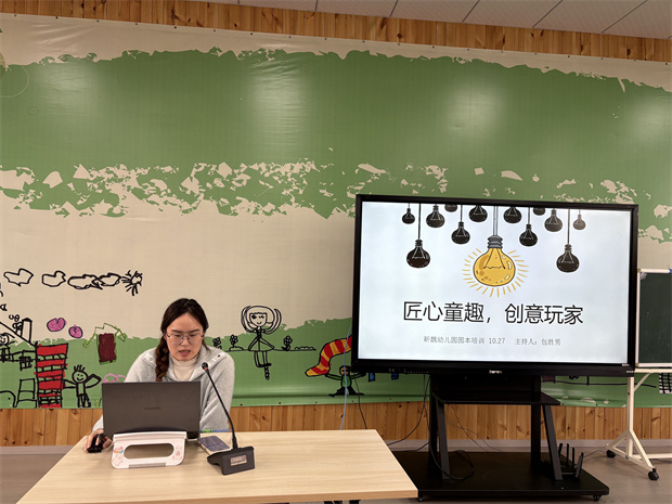 为深入挖掘木工区游戏的教育价值,激发幼儿的创造潜能与工匠精神,2025年10月27日下午,新魏幼儿园精心组织了一场以“匠心童趣,创意玩家”为主题的木工区创设专题培训活动,带领全体教师开启了一段充满智慧与创想的木工区探索之旅。本次活动由包胜男老师主持,共分为四个议程: