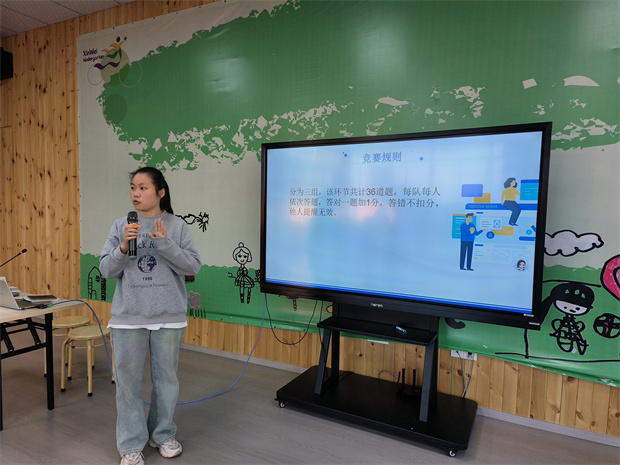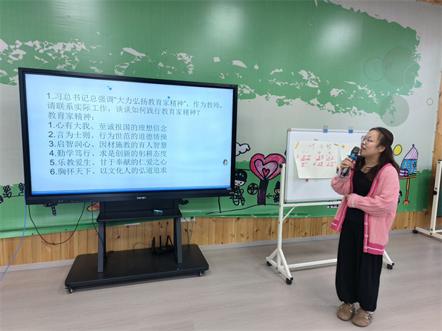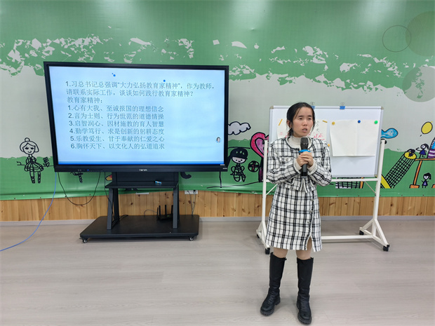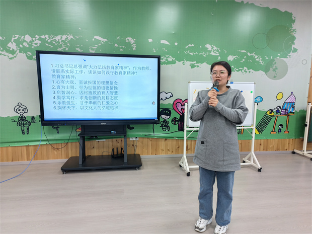 竞赛环节以年级组为单位,分为小班、中班、大班三个参赛队伍,通过“车轮战”“抢答赛”“加分赛”三种形式展开激烈角逐。题目内容涵盖师德师风规范、学前教育相关法律法规、党中国共产党成立史、历史民俗等多个方面的知识,全面检验教师对师德内涵与法治精神的理解。现场气氛紧张热烈,各队团结协作、踊跃作答,展现出扎实的理论功底和良好的团队风貌,尤其在抢答与风险环节中,教师们思维敏捷、反应迅速,在抢答中不断巩固自己的知识。最后的加分赛,各级组的代表根据相关命题,大谈自己是如何践行教育家精神,将整场活动推向高潮。
