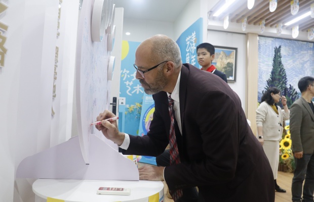 随后,代表团沉浸式探访校园多元育人空间:在顶楼击剑馆,看低年级学生专注练习击剑基本动作;移步大操场,了解棒垒球课程及球队在各级赛事中的佳绩,还与队员挥手互动;走进“食尚花园”,听跨学科知识讲解,体验“单车骑行出喷泉”装置;在美育空间,欣赏六(6)班范钧岚同学的包括油画、水彩画、素描等几十余件美术作品;到“心田万亩”心理健康中心,交流了学校心理健康教育工作;最后在翰墨阁,看书法老师书写“人”字并讲解其文化内涵,还亲手体验毛笔书写,感受汉字魅力。
