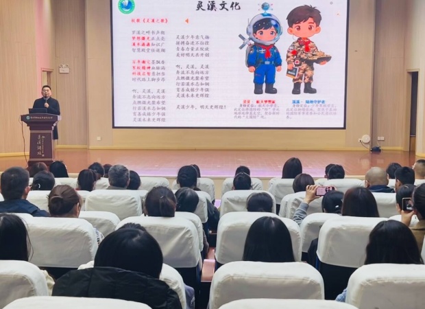 刘四青校长以《灵溪汇聚,爱伴成长》为主题,详细介绍了学校的校园环境、校园文化、课程体系等方面的举措,如早晨播放学校的秋歌《灵溪之歌》,设置国防教育课程和书法教育课程等。同时,刘校也表示感谢家长对学校工作的配合与支持,强调未来学校将致力于持续优化和提升教育服务水平,期待与所有家长形成更紧密的教育合力。