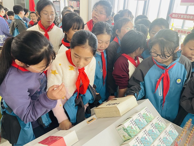 研学第一站,师生们走进“吕丁萝卜文创工厂”,开启非遗溯源之行。文创工厂的工作人员为大家带来生动的非遗课堂,详细讲解萝卜干的历史渊源与文化价值,展示了“选、洗、切、腌、晒、酿”六大制作步骤,着重强调“带皮切2-3厘米厚度保证脆感”“精准控盐激发风味”等关键技巧,让同学们近距离感受非遗技艺的匠心传承。教师们分散在课堂各处,时而协助传承人示范,时而耐心解答学生疑问,将“非遗传承”的种子悄悄播撒在孩子们心中。随后,大家分组参观现代化生产流水线,对比传统腌菜坛与无菌发酵设备的差异,深入了解萝卜干的卫生标准与储存技术,亲眼见证新鲜萝卜经过一系列工序蜕变为咸香萝卜干的“魔法过程”。互动抢答环节更是点燃全场热情,“吕墅萝卜干专用萝卜的外形特征是什么?”“杀水环节的作用是什么?”等问题接连抛出,同学们踊跃举手、积极应答,在趣味问答中夯实了萝卜干相关知识,也收获了满满的成就感。