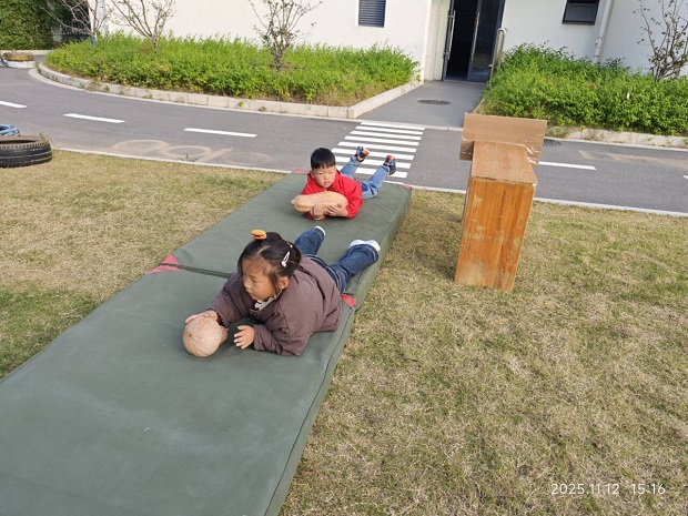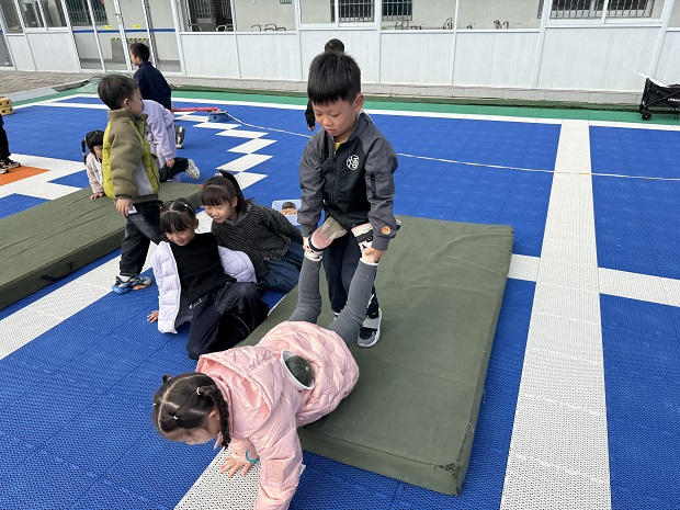 游戏一:大一班的南瓜人体车,车孩子们化身小小驾驶员,用身体搭建“南瓜战车”,在欢声笑语中穿梭于操场,体验协作与平衡的奇妙挑战;南瓜排雷小特工,引导者和拆雷者密切的配合,在无声的默契中传递信任,每一步都踏出勇气与智慧的火花。培养着团队协作的默契与责任担当,更在紧张刺激中锤炼了专注力与问题解决能力;