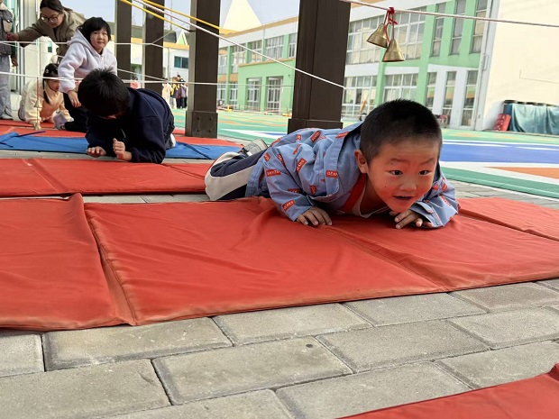 游戏三:大三班的南瓜大闯关,利用滑滑梯作为幼儿的障碍,孩子们在滑梯上快速攀爬、滑下,动作敏捷如小战士,在挑战中磨炼勇气与体能,每一次冲刺都饱含着坚持与拼搏,小小身影在秋阳下闪耀着不屈的光芒。游戏中培养幼儿的勇敢品质与坚韧意志,更在跨越障碍的瞬间收获自信与成长。