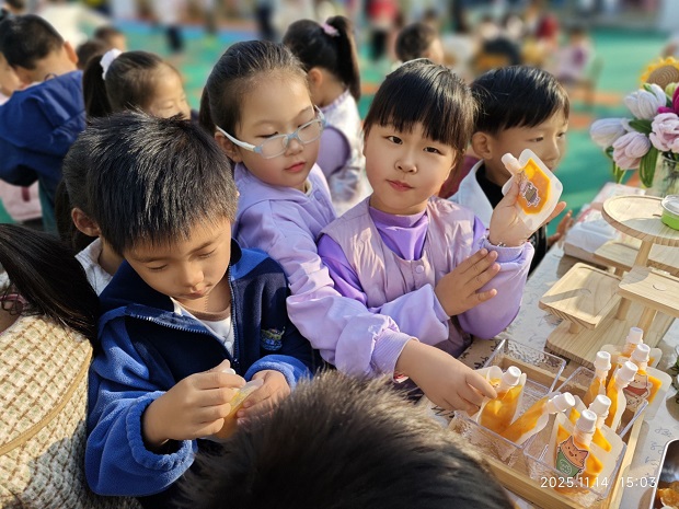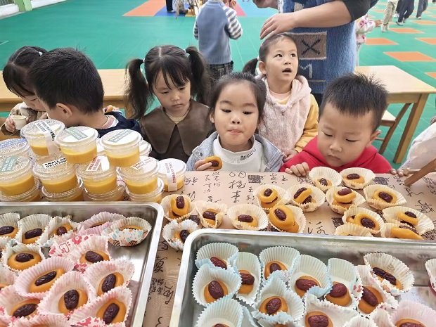 下午两点半,安家幼儿园的每个角落都飘着香香甜甜的味道,让人垂涎欲滴。经过孩子们的精心制作,南瓜美食街正式“开市”啦!南瓜焖饭咸香爽口,南瓜蛋挞香甜酥脆,蛋黄焗南瓜咸香软糯,还有Q弹的南瓜果冻、清甜的南瓜椰汁、软糯的南瓜马蹄糕…… 十余种美食整齐陈列,色泽鲜艳、造型别致,满满都是孩子们的创意与心意。各班小朋友在老师的带领下“走摊”探店,认真了解每款美食的制作故事,随后便迫不及待地排队取餐,大口品尝着自己参与制作的美味。分享的笑容挂在每张脸上,甜蜜的滋味在舌尖蔓延,也在心底沉淀。