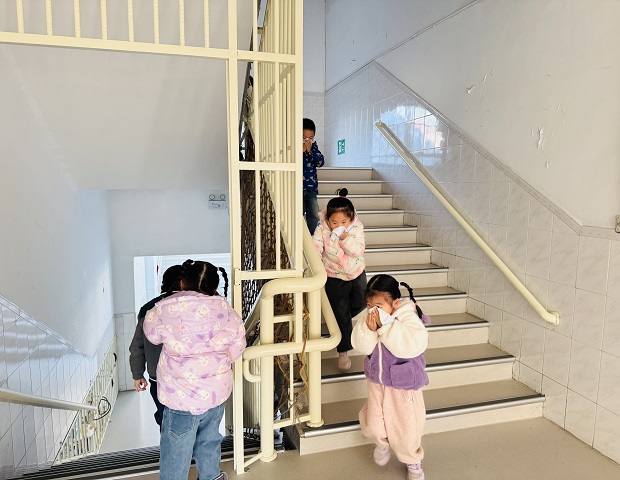 随着广播中“呜——呜——”的消防警报声响起,逃生演练正式开始。熟悉流程的老师们迅速行动,按预定方案组织幼儿用湿毛巾捂口鼻、弯腰低姿,沿安全通道快速有序撤离教室。“不要慌,跟着老师走!”“捂好鼻子,弯腰靠边走!”老师们轻声安抚幼儿,密切关注每位孩子以防掉队。孩子们在老师带领下不推挤、不慌乱,迈着整齐步伐穿过走廊、楼梯,安全抵达操场指定集合点。