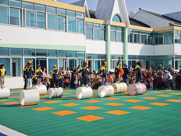 班级展示环节堪称本次开幕式的重头戏。小班的宝贝们化身“南瓜精灵”,手举南瓜气球、头戴南瓜头箍,用软萌的舞蹈和趣味十足的“南瓜保卫战”“南瓜怪偷南瓜”游戏,将南瓜的可爱演绎得淋漓尽致;中班的孩子们带着丰收的喜悦,通过滚南瓜、顶南瓜等趣味游戏和身披南瓜披风的舞蹈表演,传递着收获的甜蜜与活力;大班的哥哥姐姐们则带来了舞蹈《井冈山上种南瓜》,生动重现种瓜、盼丰收的场景,随后的走油桶等技能展示,更是展现了他们勇敢无畏的成长风采,赢得了现场最热烈的喝彩。