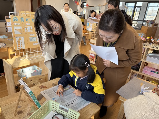 观摩过程中,两个班级还穿插了共同的互动游戏“你说我猜”。孩子们一人描述绘本中的角色、情节,另一人根据描述猜测对应的绘本名称,“它有长长的鼻子,喜欢吃树叶!”“是《大象的故事》!”清脆的问答声、欢快的笑声回荡在阅读区,孩子们在游戏中不仅回顾了绘本内容,更锻炼了表达与倾听能力。孩子们在阅读区里自主沉浸,或静静翻阅绘本,指尖划过书页感受画面与文字的魅力;或围坐在一起轻声分享书中趣事,交流自己的阅读感悟,在互动中深化对故事的理解。教师们则手持观察本,认真记录下孩子们的阅读状态、兴趣点以及精彩表达,为后续的阅读活动优化积累第一手经验。朱老师一边细致关注幼儿的阅读过程,一边观察区域绘本投放的合理性、环境营造的舒适度,详细了解班级当下阅读活动的内容及推进情况、幼儿阅读兴趣焦点等,并不时与随行的行动小组成员交流看法、探讨优化方向。