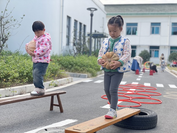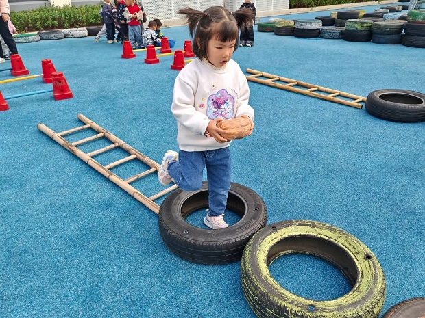 小二班的“南瓜跳跃挑战”则充满了勇气与力量。活动区里,低矮的栏杆、安全的软梯、轮胎组成了层层关卡,孩子们抱着南瓜站在起点,眼神坚定。在老师的引导下,他们双脚并拢,纵身一跃,顺利跳过栏杆时的欢呼;手脚并用,稳步爬过软梯时的专注;小心翼翼,跨过轮胎时的认真,都展现着小班幼儿的活力与毅力。“我抱着南瓜也能跳很高”“这个轮胎一点都不难”,孩子们在跳跃中不仅锻炼了下肢力量,更收获了挑战自我的勇气。