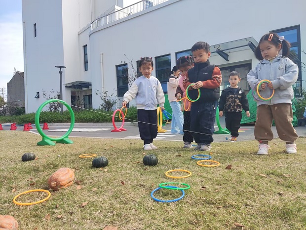 小三班的“南瓜滚滚乐”让孩子们体验到了别样的乐趣。老师们将南瓜摆放在指定区域,孩子们则拿着彩色圆环在规定线外瞄准投掷。有的孩子屏住呼吸,瞄准目标轻轻一抛,圆环稳稳套住南瓜时,立刻兴奋地拍手叫好;有的孩子虽然初次尝试未能成功,但在老师的鼓励下再次尝试,最终收获成功。