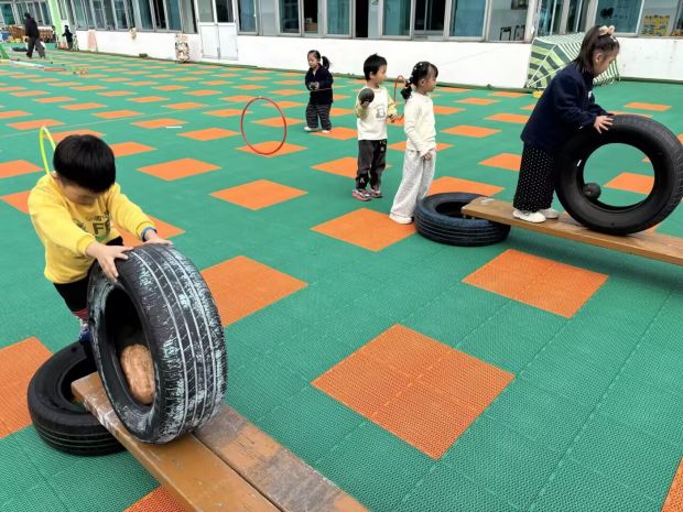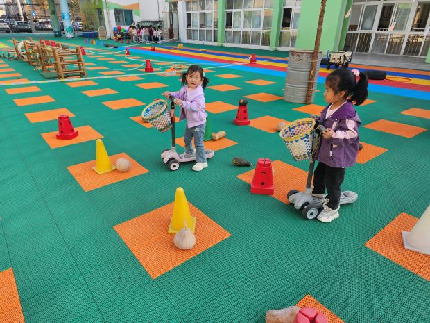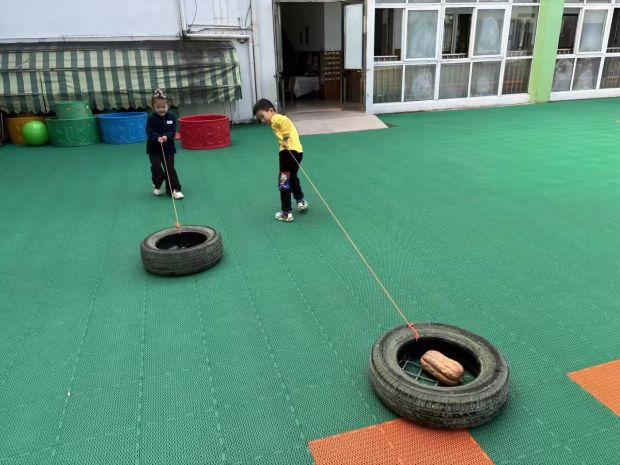 中一班的《南瓜大狂欢》游戏现场,俨然是一片南瓜的欢乐海洋。孩子们或抱着圆滚滚的南瓜进行接力赛,在奔跑中感受速度与平衡的挑战;或用南瓜玩起 “套圈” 游戏,小小的圆圈瞄准南瓜,在一次次尝试中收获精准与快乐;还有的孩子发挥创意,将南瓜与轮胎结合,在推动轮胎运输南瓜的过程中,锻炼了力量与协作能力。每一个孩子的脸上都洋溢着兴奋的笑容,在与南瓜的亲密互动中,尽情释放着童真与活力。