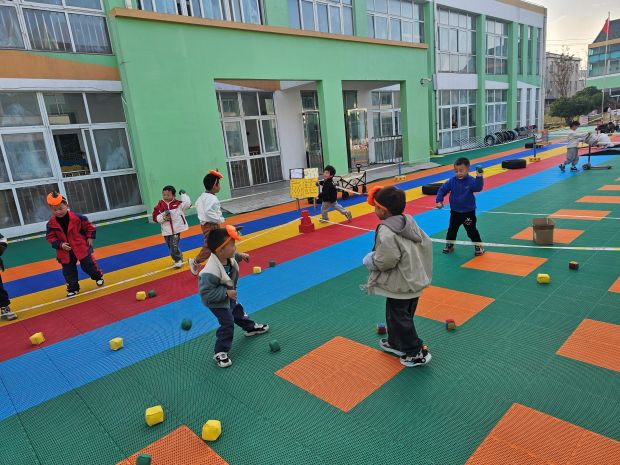 中四班的《欢乐采南瓜》和《独轮运南瓜》游戏,将丰收的喜悦与体能挑战完美融合。孩子们穿梭在 “南瓜地” 里,挑选成熟的南瓜,采摘的瞬间满是收获的幸福。每一次成功运输都伴随着阵阵欢呼,在挑战自我的同时,也享受着运动与收获的双重快乐。