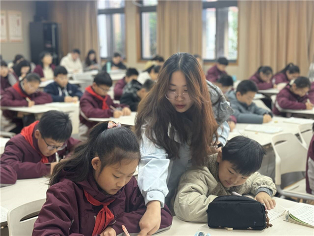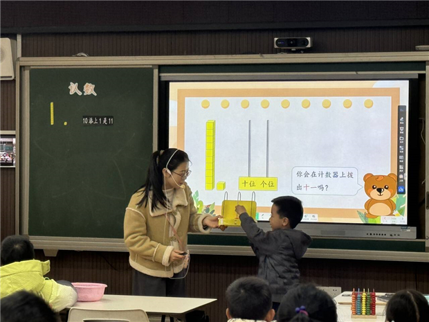 一年级顾昕老师执教《认识11-19》,顾老师立足低年级学生具象思维为主的认知特点,精心设计了“数数—摆方块—拨计数器—读数写数”的递进式教学流程。课堂上,教师引导学生亲手操作小方块,在“10添上1是十一”的数数中感受到了十一是十后面的一个数;通过计数器拨珠的动态演示,让学生直观感受“11”的组成。学生通过具体的操作、直观的数线图将抽象的数字与具体生活场景相结合,有效降低了学生的认知难度,充分调动了学生的参与热情。