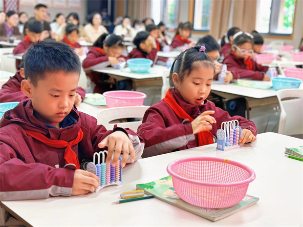 第一课《认识100》,龙虎塘第二实验小学何秋婷老师从生活中的数数情境出发,激发学生认识大数的兴趣。基于数的组成、结合小方块、计数器的实操体验,在动手实践中凸显“10个十是一百”的核心逻辑。整节课何老师引导学生有序数数、主动探究,注重学生的数感培养与表达交流。