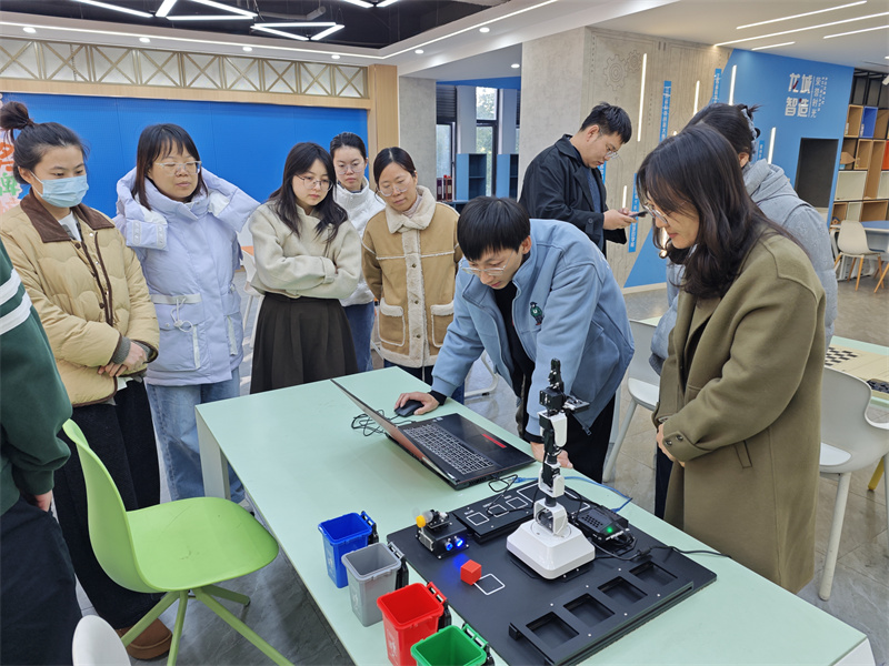为推进人工智能教育在小学阶段的深度融合,提升师生的科技素养与创新能力,11月4日上午,程英信息化教学工作室与杨康龙城智造工作室在龙城小学创客中心联合举办了一场别开生面的人工智能教育套件使用培训活动。本次活动聚焦于人工智能机械臂在教育场景中的实际应用,吸引了全校科学、信息科技及部分其他学科骨干教师积极参与。