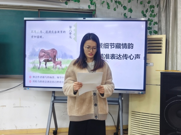 各组教研氛围浓厚,教研活动各有侧重、层层深入。全体语文教师在交流中碰撞思维,在研讨中凝聚共识,通过分组共研的实效性,稳步提升课堂教学质量,为学生的语文素养成长奠定坚实基础。坚信在我校语文教师的共同努力下,各阶段语文教育生态必将迈上新的台阶!胡鑫琪老师结合大单元整体教学,分享《析场景细节藏情韵,以精准表达传心声》的教学设计思考。