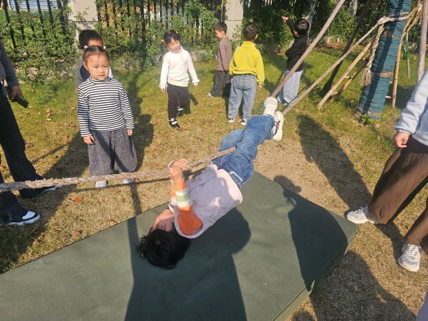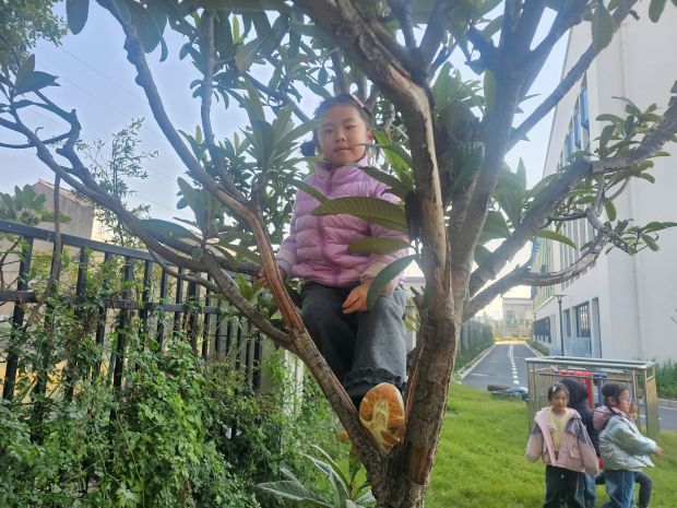 “树林游戏日”的欢乐从幼儿园操场就已开启。枇杷树下,专门为孩子们改造的“安全爬树区”热闹非凡。树下包裹着柔软的防撞垫,几名孩子正手脚并用地向上攀爬。“手抓牢,脚蹬稳,慢慢来!”在老师的鼓励下,孩子们勇敢的尝试不同的大树游戏。