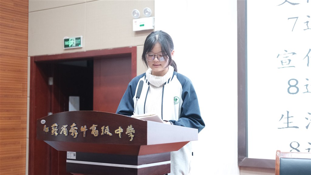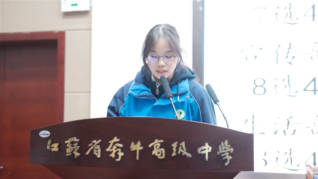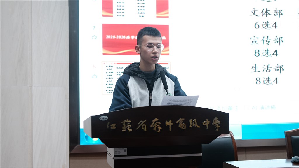 第二项议程是听取和审议由上一届学生会主席刘恒嘉作的《江苏省奔牛高级中学2024-2025届学生委员会工作报告》。他在报告中全面回顾了上届学生会成员在学校管理各个维度积极主动的身影,肯定了所有学生会成员能够有条不紊地组织校园活动,帮助老师更好地管理学校,发挥自身特长,奋发主动作为,在团队中奉献出自己的能量,展现了学生会这一优秀学生群体的优良素质。