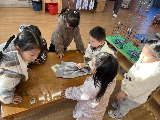 活动伊始,教师以一首朗朗上口的《叠衣歌》开启课堂:“小小衣服铺铺平,两扇大门关关紧,两只小手抱一抱,弯弯腰来点点头。”配合生动形象的肢体动作演示,孩子们立刻被吸引,纷纷模仿起“关大门”“抱一抱”等动作。教师将叠衣步骤分解为“铺、折、抱、压”四步,用拟人化的语言帮助幼儿理解,并通过“找朋友”游戏让幼儿两两配对,互相检查衣服是否“关紧门”“抱整齐”,在游戏中巩固记忆。