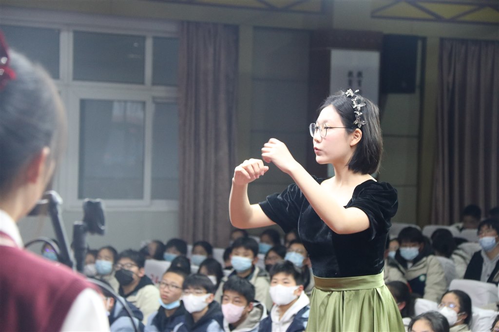 红歌不仅是豪迈的战歌,也饱含细腻的情感表达。八25班以清澈嗓音演绎《萱草花》,将母爱与家国情怀巧妙交融;八16班带来轻快活泼的《一想到你呀》,传递青春的纯粹喜悦;八21班演唱经典《送别》,在“芳草碧连天”的意境中寄托离愁与希望;八9班重温苏联经典《喀秋莎》,展现跨越国界的和平向往。而八20班的《有我》与八27班的《把未来点亮》,虽具现代气息,却同样承载着“强国有我”的承诺与对未来的无限憧憬。