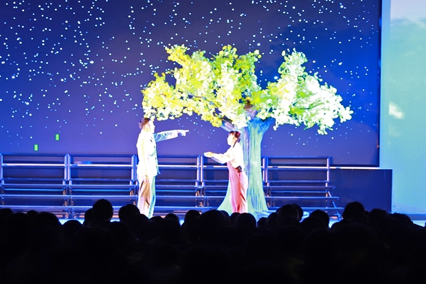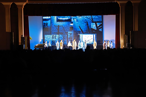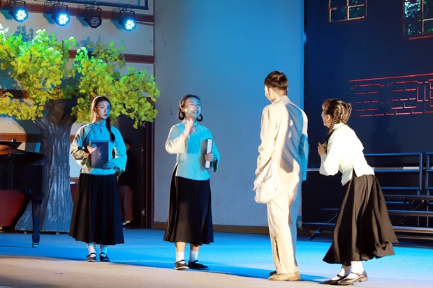 《野蜂飞舞》改编自黄蓓佳同名小说,以抗战时期华西坝为背景,讲述女孩黄橙子与少年沈天路在战火中结下深厚情谊、共同成长的感人故事。作品通过鲜活人物与动人情节,展现一代青年的家国情怀与纯真理想。演出过程中,全场座无虚席,师生们凝神观看,深深沉浸在剧情之中。