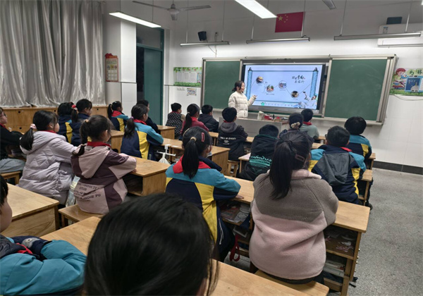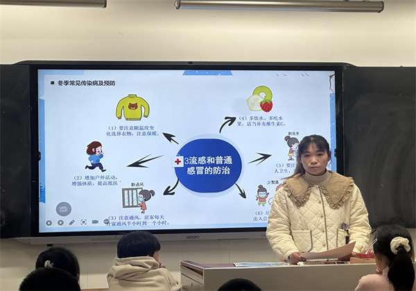 课堂上,苏雅若妈妈结合冬季气候特点,围绕同学们身边常见的传染病展开详细讲解。她不仅系统介绍了流行性感冒、普通感冒、水痘、手足口病、麻疹等冬季高发传染病的病因、传播途径和典型症状,还重点分享了针对性的预防措施;同时强调了接种疫苗的重要性,以及出现不适症状时及时就医的必要性。此外,苏雅若妈妈还分享了枣姜汤驱寒、冷水洗脸强体、床头放置柑桔清新空气等实用小技巧,让同学们在日常生活中就能轻松做好防病准备。
