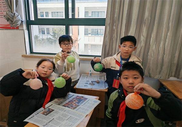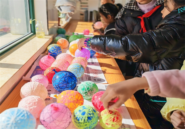 课堂上,黄宜恬妈妈精心准备了五彩毛线、气球、白乳漆等材料,耐心讲解制作的步骤,示范吹气球、打结、缠绕线等技法。孩子们兴趣盎然,全神贯注地跟随步骤动手实践。从最初的生疏笨拙,到逐渐掌握技巧,一根根毛线在孩子们的指尖穿梭,缠绕成一个个充满童趣的彩色球。遇到困难时,同学间互相帮助,老师耐心指导,课堂氛围温馨而活跃。