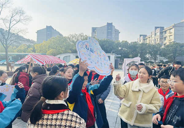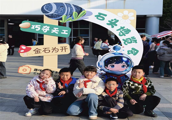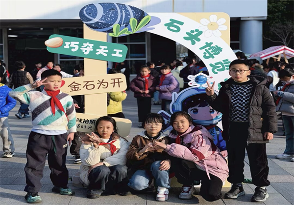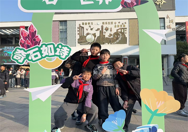 逛摊结束,每个年级都在摊位前定格了笑脸:一年级举着拼音石头比“剪刀手”,脸颊上的腮红跟着笑容晃;三年级围着“石头故事板”挤成一团,连讲解员的麦克风都被挤得歪了头;六年级的学生轻轻靠着“梦想感恩石墙”,有人偷偷摸了摸石头上的字,眼里亮着细碎的光。师生们围着六组摊位前的合影框拍照,阳光裹着石子的温度落下来,把一张张笑脸映得暖融融的。