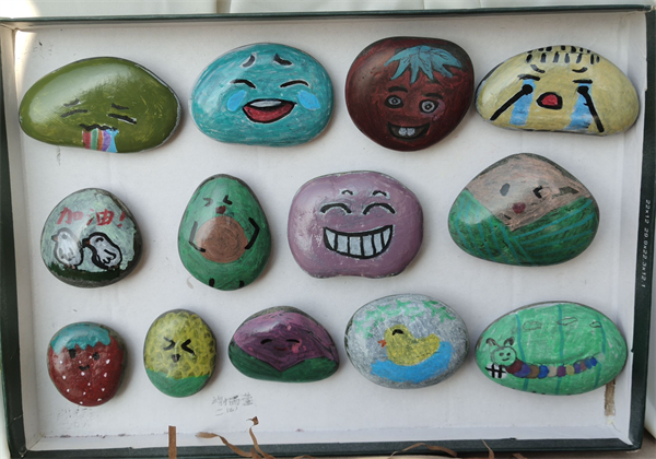 二年级「石头表情铺」:哭脸、笑脸、“吃瓜脸”的石头排排站,连“生气撅嘴石”都配了搞怪文案,参观者刚走过去,就被“傲娇白眼石”逗得直笑。