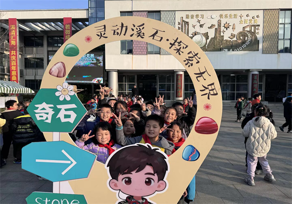 初冬的风裹携着一丝凉意,却裹不住罗溪中心小学里热闹的气息。12 月 18 日午后,教学楼大厅前的户外广场早早就支起了六个摊位,摊位前的展板上,“石头博览会”五个彩色大字晃得人眼亮。谁能想到,一周前还散落在操场角落、溪滩岸边的普通石子,此刻正被灵溪娃们“打扮”成拼音、表情包、故事主角,甚至是藏着梦想的 “感恩信物”。当下课铃变成“开市铃”,六个年级的“石头创意摊位”正式开摊,全校师生揣着好奇与期待,一头扎进这场关于“石头” 的趣味狂欢里。