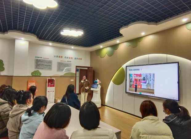 讲座结束后,家长们移步至团辅室,参与了“AI小灵”的使用方法与操作体验环节。“小灵”不仅能通过语音交互耐心倾听孩子们的烦恼与喜悦,还能基于人工智能的情感分析能力提供个性化的心理支持和引导。丁老师现场指导家长体验相关操作,帮助家长了解在人工智能日新月异的今天,我们将科技与心理健康教育融合在一起,为孩子的成长增添了数字化助力。