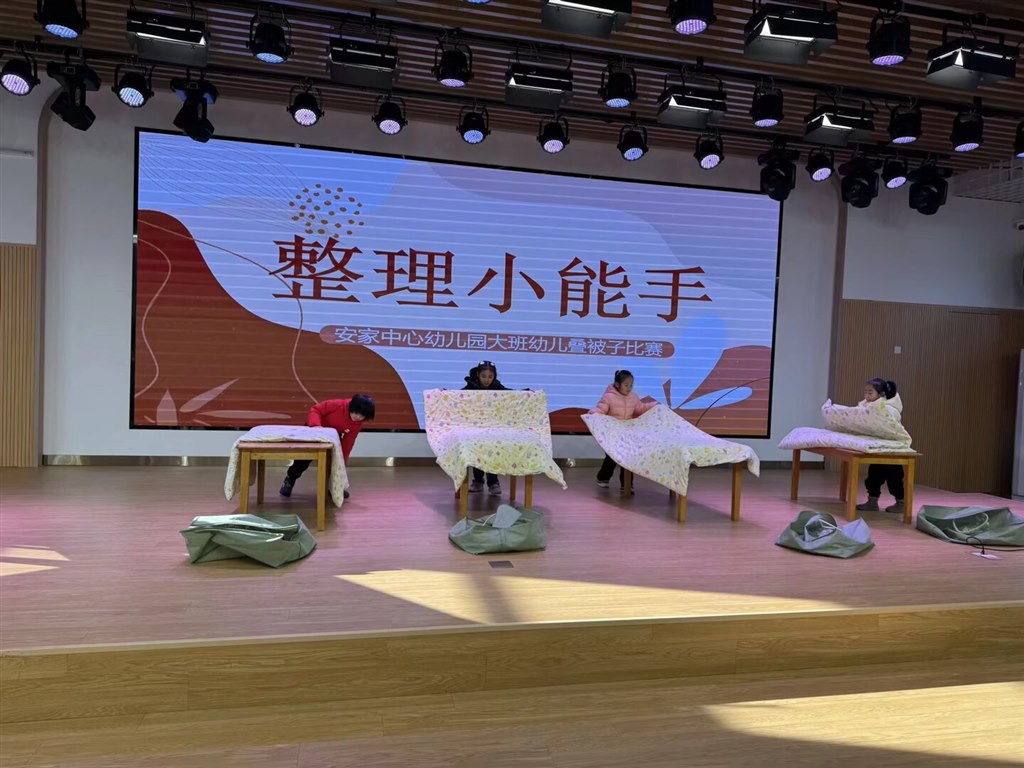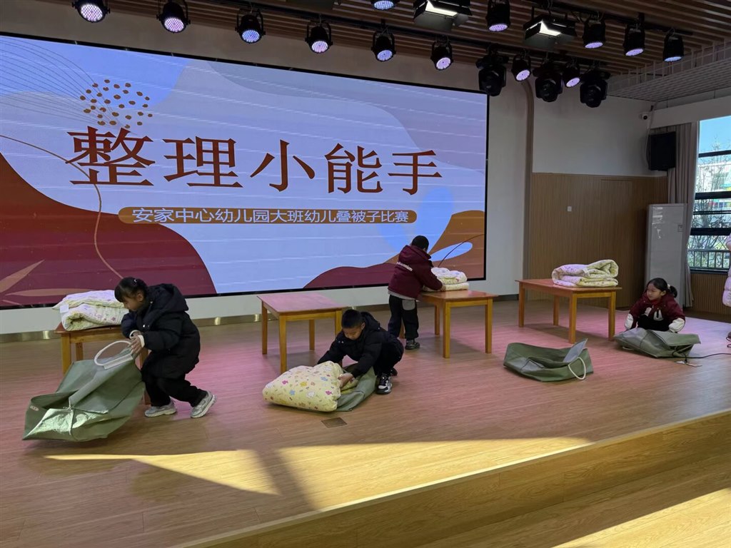 “两个好朋友,手抱手,翻个跟头点点头……”12月26日上午,安家中心幼儿园一楼多功能室内童趣盎然、气氛热烈,一场别开生面的《整理小能手》叠被子比赛正在这里举行。大班的小选手们全神贯注,一双双小手在被面上忙碌而有序地铺展、折叠、整理,展现出令人惊喜的动手能力与自理风采。